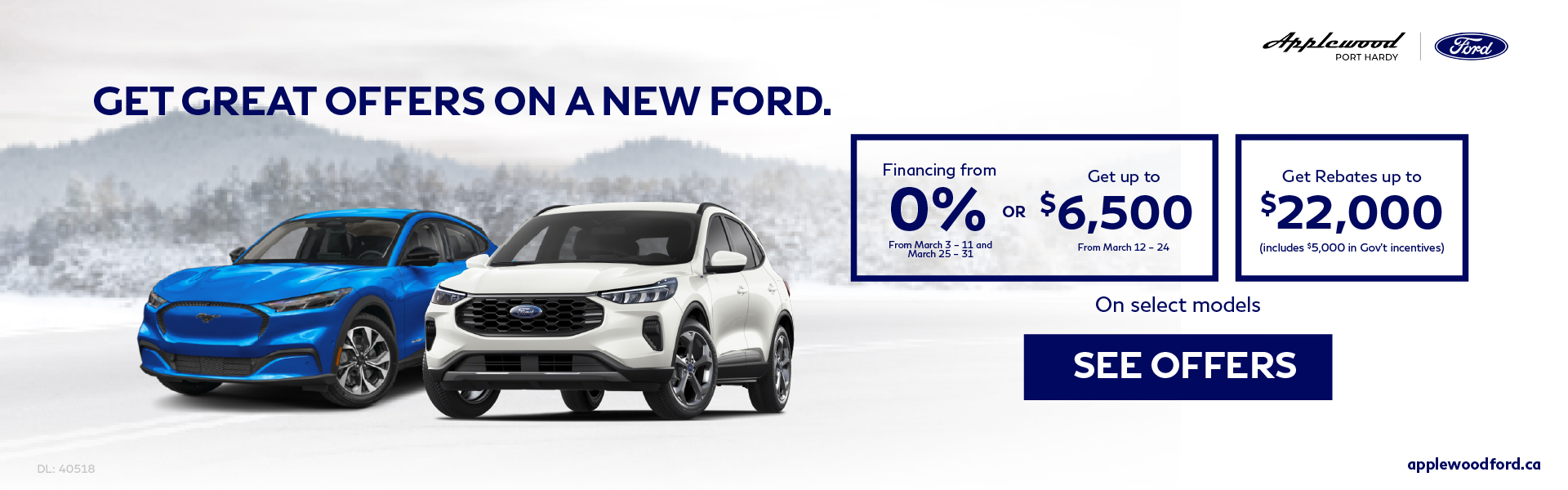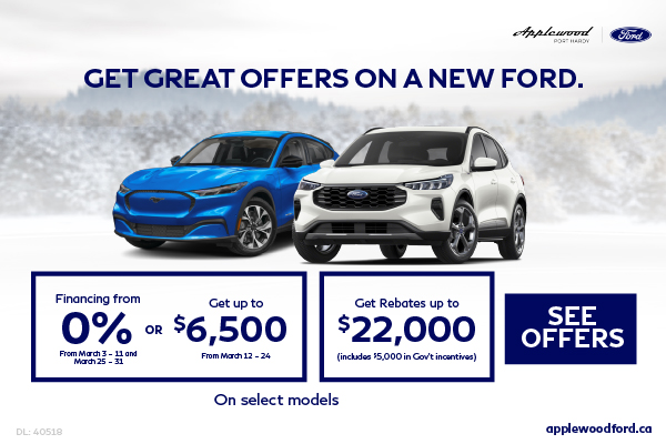 Disclaimer: Finance and Lease offers on approved credit. Regional offers, lease and finance conditions apply. See your local Ford dealer for more information. Use of any calculation and/or tools on https://www.applewoodford.ca does not constitute an offer of direct financing or any particular lease, finance, purchase option or transaction. Calculation and tools are intended for illustrative purposes only. Rates and requirements may vary depending on credit worthiness. Every effort is made to ensure the accuracy of the content on the pages on https://www.applewoodford.ca. In the event of a discrepancy, error or omission, vehicle prices, offers and features as established by Ford Canada and participating Ford dealers in Canada, will prevail.