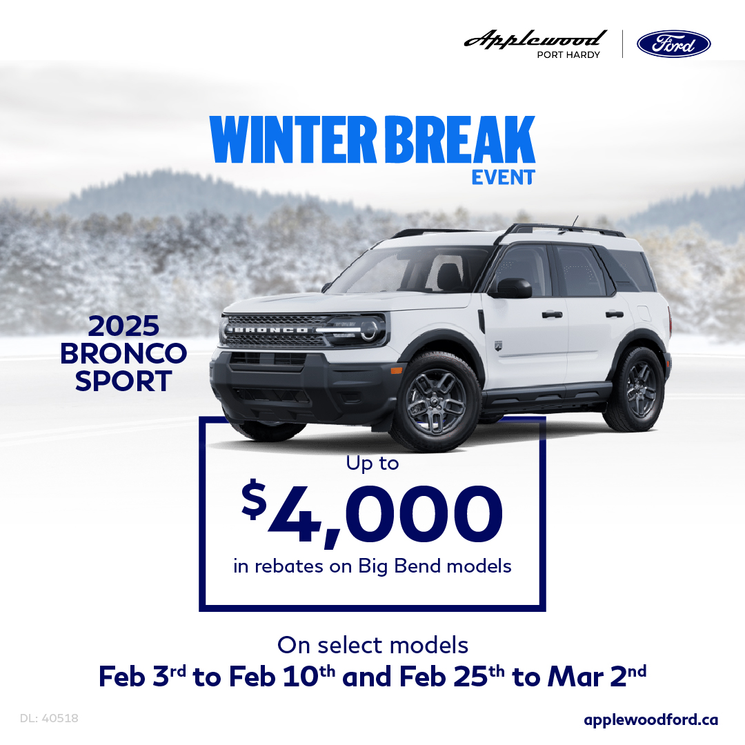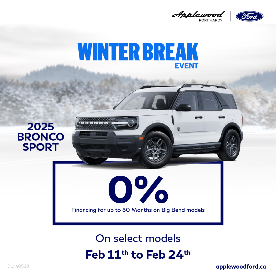 41 Retail offer valid at participating dealers from February 11 – 24, 2026. Dealer trade may be necessary (but may not be available in all cases). Receive purchase financing from 0% APR for up to 60 months on a new 2025 Ford Bronco Sport Big Bend model on approved credit from Ford Credit Canada Company for qualified retail customers. Not everyone will qualify for this offer or the lowest interest rate. Dealers set selling price and may sell for less. Example: Finance $41,190 with $0 down payment at 0% APR for 60 months, monthly payment is $687 (total of 60 monthly payments); interest cost of borrowing is $0; and total to be repaid is $41,190 (except in Quebec where the total is $41,249 which includes $59 fee related to the RDPRM registration payable upon signature). See your Ford dealer for details.